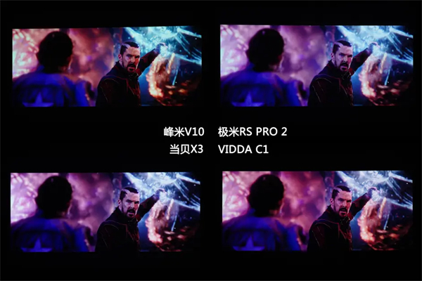 在《旺达寻亲记》的开头有段激烈的追逐戏,考验投影的MEMC运动补偿功能,4款产品都可以达成如丝般顺滑的流畅感。人物细节有所差别,峰米V10和VIDDA C1面色红润有光泽,接近显示器呈现的效果,极米RS Pro 2与当贝X3 Pro则因为绿色输出偏弱,致使整体画面偏紫。