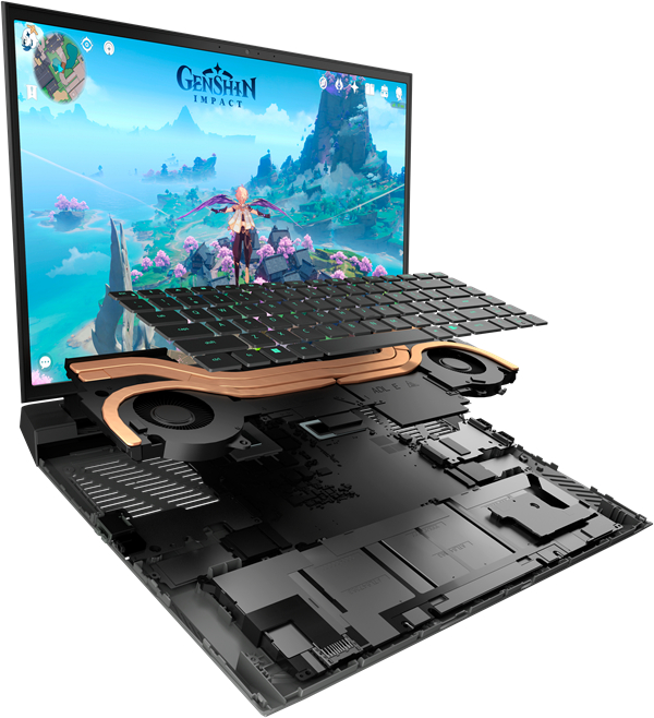 游匣G16搭载双风扇四区域散热模组,双进四出四铜管的散热设计,内部配备了约194片0.2mm超薄风扇叶片,为散热留出更多内部空间,并且增大键盘上方通风孔面积,加强空气流通,提高散热效率,风量对比上代产品最高提升18%,散热给力,使整体性能释放拉满,畅玩主流3A大作游戏毫无压力。