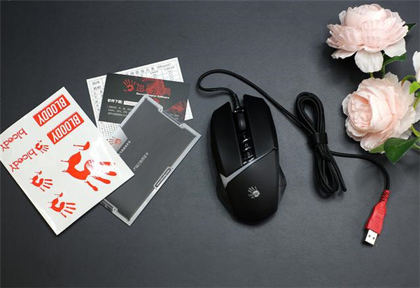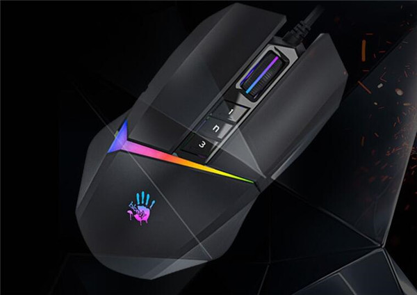 整个鼠标为黑色磨砂质感,带有细密的纹理。正中顶部带有特别设计的闪电状RGB彩漫灯,左右键中间滚轮及背脊上的血手幽灵LOGO在工作中也带有色彩,充满浓郁的电竞风格。