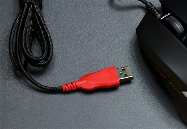 USB插口带有品牌标示鲜艳红色颇为醒目。线缆为编织线设计,结实耐磨抗拉。