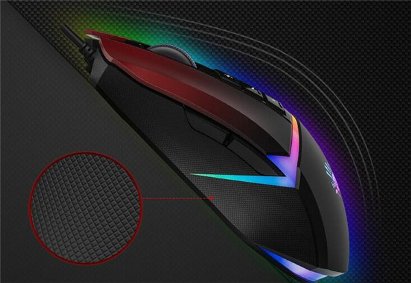 鼠标正面采用了磨砂处理,防滑效果和操作手感俱佳,作为手掌区域和按键区域的分割,一条1680万色、15区的V字形的REB灯带从鼠标左侧一直横穿过整个正面,动感十足,在游戏时更加凸显氛围。
