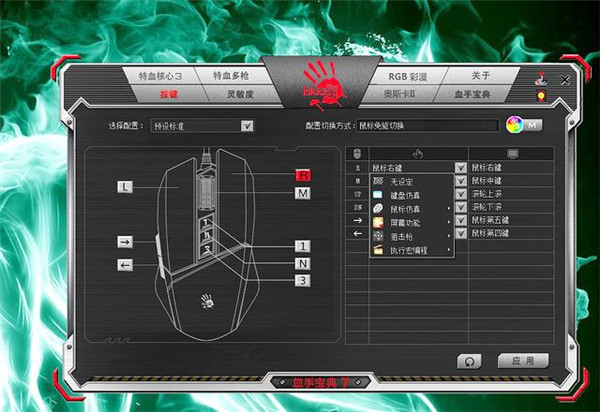 初次使用需要下载与安装血手幽灵对应的驱动程序。在设置中可以自定义灯光效果,以及各按键的功能定义。界面中提供了核心3、特血多枪、RGB彩漫、按键、灵敏度、RGB彩漫等多项模块选项可以进行调节,对应游戏玩家来说十分友好。