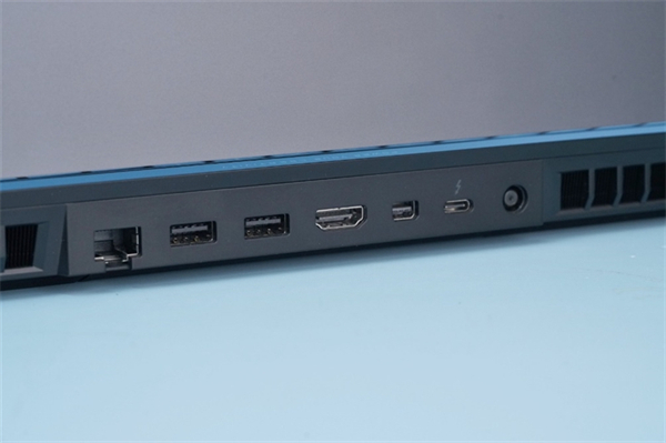 顶部的接口非常丰富,有一个千兆网口、2个USB 3.2 Gen2接口、1个HDMI接口、1个Mini DP接口、一个雷电4接口以及圆形充电接口。