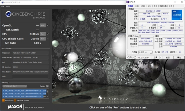 在CineBench R15测试中,i7-12650H的单线程分数为260cb,多线程分数为2338cb。