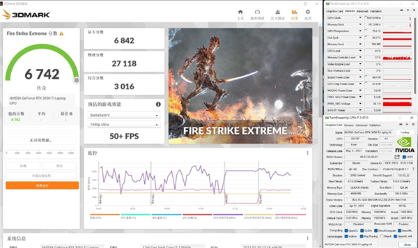 Redmi G游戏本2022搭载的是一块95W的满血版RTX 3050 Ti 独显,在3DMark Fire Strike测试中,图形分数为6842.运行时最高频率为1957MHz,最高温度75度,最高功耗99W。另外,i7-12650H的物理分数是27118.
