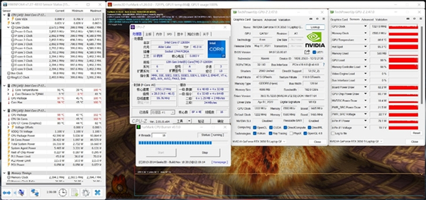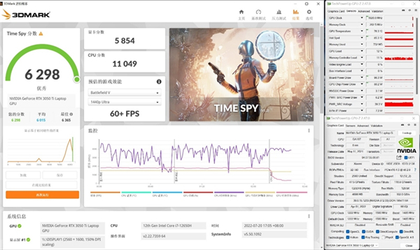 在3DMark Time Spy测试中,RTX 3050 Ti的图形得分是5854.最高温度76度。最高运行频率可以达到1920MHz,最高功耗96W。i7-12650H的物理分数是11049.