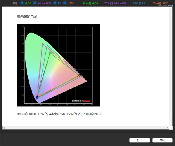 99%的sRGB色域、75%的Adobe RGB色域、75%的P3色域以及70%的NTSC色域,素质不错,玩游戏绰绰有余。