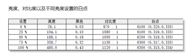 实测这块屏幕的最高亮度为480nit,十分接近官方500nit的数据。静态对比度为1120:1.
