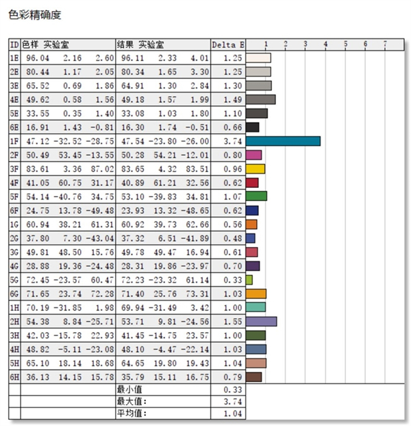 Redmi G游戏本2022出厂前应该是经过了校色处理,实测平均Delta-E值为1.04.最高3.36.最低0.36.算是非常优秀的表现,可以胜任几乎所有的视频与图像设计工作。