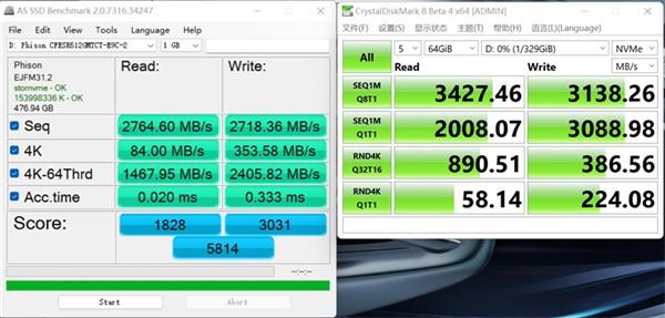 CrystalDiskMark实测最高顺序读取3427MB/s、顺序写入3138MB/s。