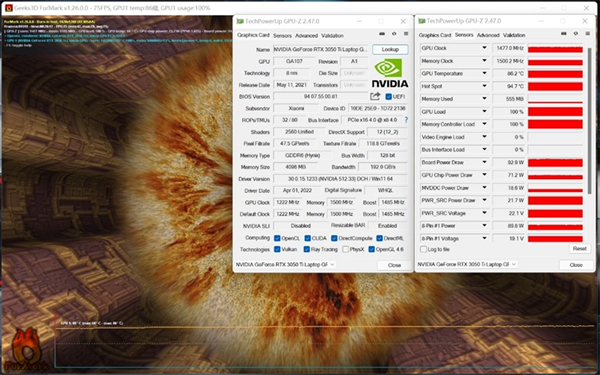 单烤GPU,烤机20分钟,RTX 3050 Ti温度稳定在86度,频率1477MHz,烤机功耗93W。