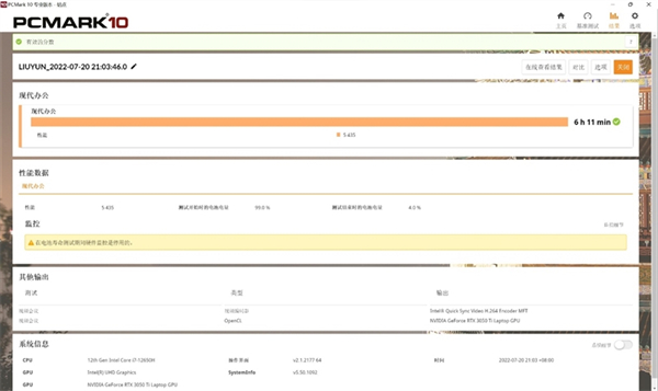 在PCMark 10现代办公场景下的续航测试成绩达到了6小时11分钟,这样的成绩对于游戏本而言,可以接受。