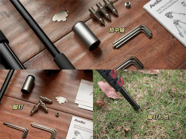 阿维拉A154P套装,这里面包含了A154P脚架、V504液压云台和MBP1脚撑。当然具体如何搭配,根据每个人的需求选择就好。脚撑这个因为我有时候的空间有限,需要一个更小的三脚撑,所以就选了。而A154P脚架和V504液压云台的搭配,则是更常用的搭配。除了三个主件,阿维拉也配套了短中轴、六角扳手、拧快装板螺丝的铁片和脚钉等附件,以便日常不同场景的使用。脚钉这个我还是第一次接触。脚架的底部常见是三个防滑脚垫,而A154P的三个脚垫是可以更换成脚钉的。这一点在一些户外拍摄环境上面,会更实用。因为脚钉可以扎进地面,带来更加稳固的效果。