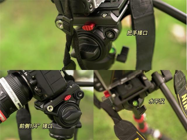 再看到V504液压云台,也给了很多丰富的细节设计。云台采用了通用的3/8”接口,安装在其他类型的脚架上面也是可以的。