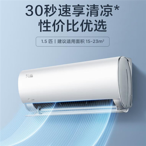 Midea 美的 风酷 KFR-35GW/N8XHC3 壁挂式空调1.5匹,配备第二代双层导风板,送风范围更广,防直吹效果更好。基于智能PI控制器和高精度观测算法,压缩机快速高频启动,急速制冷热,一键开启“智控温”模式,先快速降温后,自动回温至体感舒适温度。显示屏智能光感,第四代自清洁,支持APP控制,0.5℃调节,无极风速。能效比4.29,新三级能效,循环风量650m/h。适用面积15-23㎡,6年质保。