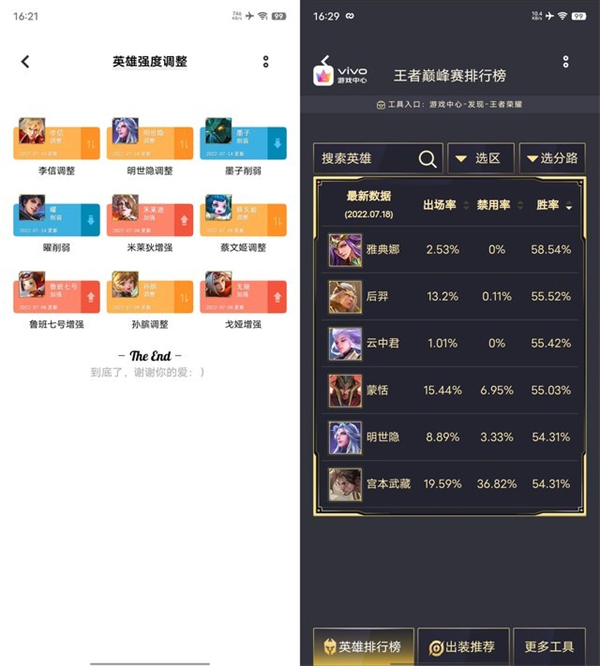不过,在iQOO10系列手机中搭载的游戏中心,对于游戏的每一次版本更新变动,都会有相关的文章和视频对新版本进行解读。以最近的一次《王者荣耀》更新为例,目前在iQOO10系列的“游戏中心”已经推送了相关的攻略内容,并将每个版本英雄强度的调整汇总成了精简的表格,一目了然。