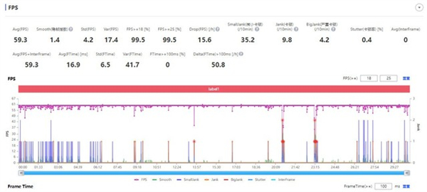 更考验性能的《原神》,游戏画面设置全高,帧率60.运行三十分钟平均帧率为59.3帧。