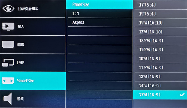 它还具备一个SmartSize功能,可以模拟17英寸到27英寸的不同比例显示画面,呈现在显示器中部,并将多余面积留黑。由于OLED黑色不发光的特性,这个功能使用起来更接近真实效果,体验更好。对于有相关需求的玩家来说可以算得上是非常方便。