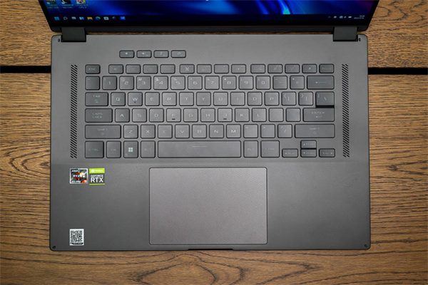 C面键盘的设计基本与上一代保持一致,左上角是四颗独立按键,不过电源按键则是被重新设计在机身右侧接口旁边。键盘支持背光,拥有1.7mm的键程,支持全键无冲。引力波的设计也延伸到C面的触控板上,触控板的面积也非常大,使用起来体验不错。