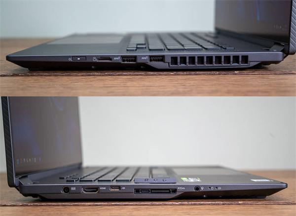 在接口方面,ROG幻16也相对比较丰富,右侧依次为开机电源键、MicroSD读卡器以及2个USB 3.2 Gen2 Type-A接口,而左侧依次为电源接口、HDMI 2.0、支持DP1.4与PD充电的USB 3.2 Gen2 Type-C、ROG XG拓展坞接口以及3.5m音频接口。