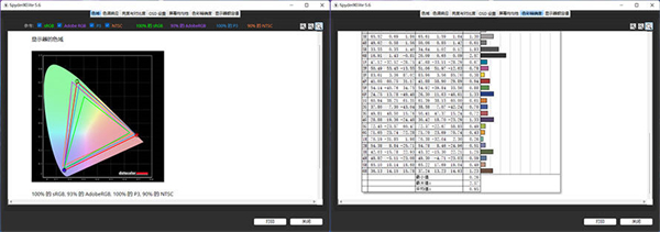 首先我们还是先对ROG幻16的屏幕进行了色域色准方面的测试,通过红蜘蛛的测试不难看到,ROG幻16的屏幕覆盖了100%的P3色域,100%的sRGB色域,平均色彩偏离值小于1.