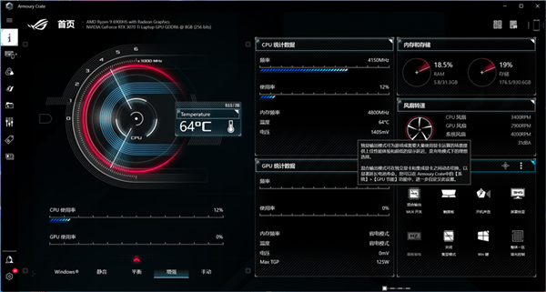值得一提的是ROG幻16支持了双显三模显卡切换,奥创智控中心里提供了MUX开关,可让我们选择使用独显输出模式或混合输出模式,前者更适合游戏及需要大量使用显卡运算的场景,而后者则可以在独立显卡和集成显卡之间进行动态切换,以延长电池续航。以下测试均在增强模式、独显输出模式下进行。