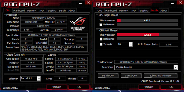 我们上手的这款ROG幻16搭载了AMD锐龙9 6900HS处理器,这颗处理器采用“Zen3+”架构,8核16线程,最高加速频率可达4.9GHz;配备英伟达GeForce RTX 3070 Ti 8GB显卡,最高125W功耗,支持光线追踪与DLSS。无论是锐龙9 6900HS还是RTX 3070 Ti,在性能方面都已经被充分验证过。