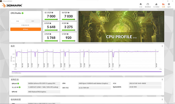 3D Mark的CPU PROFILE测试中,单线程得分920分,8线程得分5648.16线程得分7030.最大线程得分是7000分。