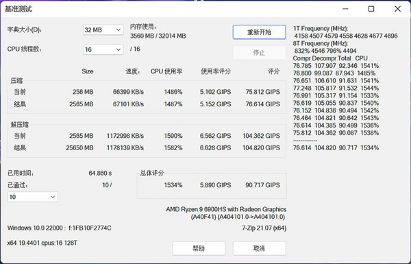 7-Zip解压缩测试,得分为90.717GIPS。