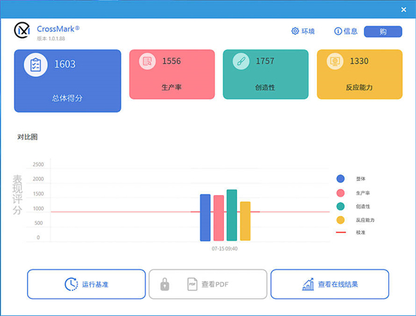 CrossMark测试,生产力1556分,创造性1757分,反应能力1330分,总体得分1603分。