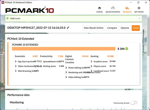 PCMark 10 Extended测试总分为8394分,其中游戏项目得分为19988分,基础得分8897分,生产力得分7534分,数字内容创作10014分。