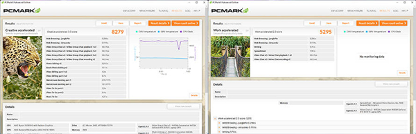 PCMark 8 Creative项目测试,得分为8279分,Work项目测试,得分为5295分。