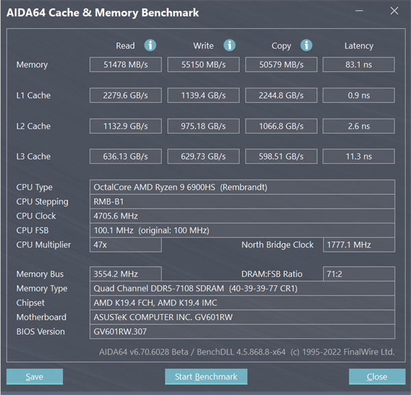 ROG幻16是采用了DDR5-4800内存,我们这台内存容量达到了32GB,内存读取速度达到了51478MB/s,内存写入速度为55150MB/s,内存复制速度则为50579MB/s。