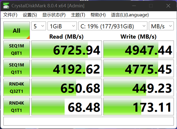 在存储上,我们手上这台ROG幻16则是采用了美光的1TB PCIe 4.0固态硬盘,CrystalDiskMark测试,顺序读取为6725MB/s,顺序写入为4947MB/s。另外值得一提的是ROG幻16是给了双M.2 2280固态硬盘位,支持组建RAID 0.如果你想要追求极致的速度,倒是可以再多装一块硬盘。