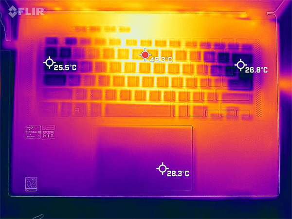 首先是使用AIDA64进行FPU压力测试,可以看到30分钟测试之后,CPU的功耗始终保持在75W左右,性能释放比较稳定。此时键盘WASD区域的温度为25.5℃左右,触控板的温度为28.3℃上下,最高温出现在机身中上方,达到了45.3℃。