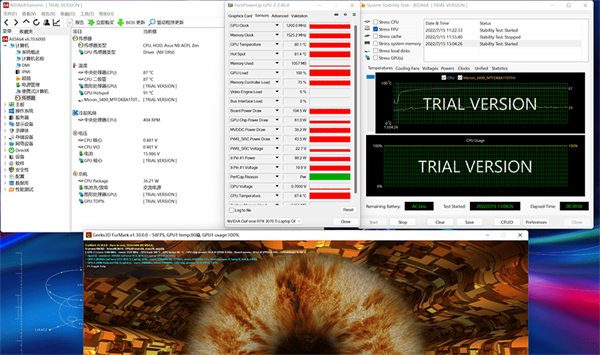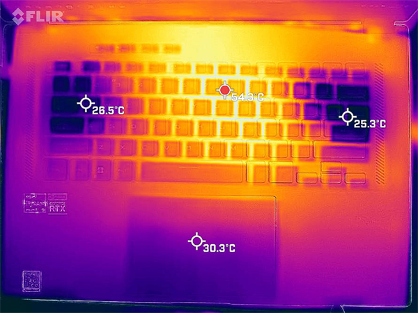 使用AIDA64与FurMark进行双烤测试,在30分钟之后,显卡整体功耗维持在104.5W,温度为80℃,显卡的频率为1200.0MHz,CPU的功耗则是为36W。此时键盘WASD区域的温度为26.5℃左右,触控板的温度为30.3℃上下,最高温达到了54.3℃。