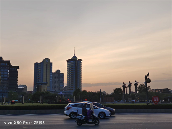 比如上图中黄昏下的一处街景图,整体光线环境比较昏暗,但是vivo X80 Pro还是很好地将画面原本的样貌还原了出来,远处伫立的高楼和近处行驶的车辆虽然受到了一定的光线影响,但对于整个画面的还原无伤大雅,真实、自然,是vivo X80 Pro在拍摄过程中给我的最大感受。