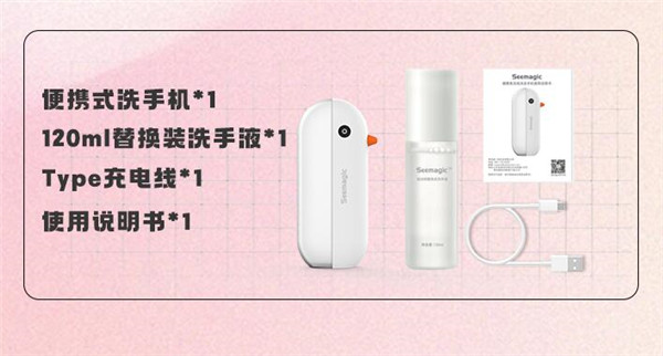 包装内除了便携洗手机一部、120ml替换装洗手液,洗手机的水箱容量为40ml,可以替换三次。Type充电线一根,可以与其他设备共用,充电也变得更加方便快捷。此外,还有使用说明书一份,内容图文并茂,清晰明了。