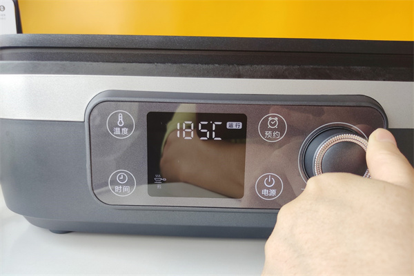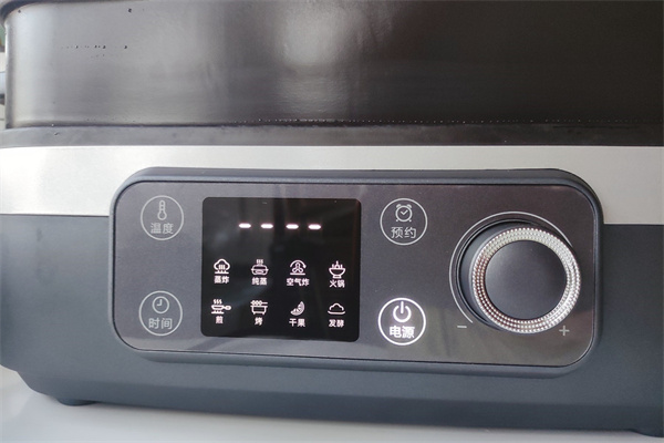 主机下方是控制面板,中间是数字显示屏,主要用来显示温度时间以及功能显示,数字显示屏两侧四个触摸按键,和一个功能选择旋钮。四个触摸按键分别是:温度时间预约电源,而选择旋钮主要是功能的选择,或增加/减少。