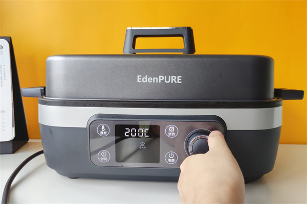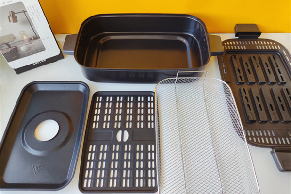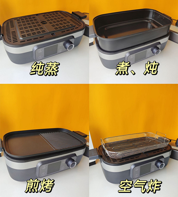 简单的说就是宜盾普多功能料理锅集空气炸锅煎锅电蒸锅烧烤炉火锅等多个小电器与一身,一台抵多台,多才多艺。搭配不同的烤盘实现空气炸蒸汽炸煎烤炖蒸煮等等。下面展示一下搭配不同烤盘的样子。