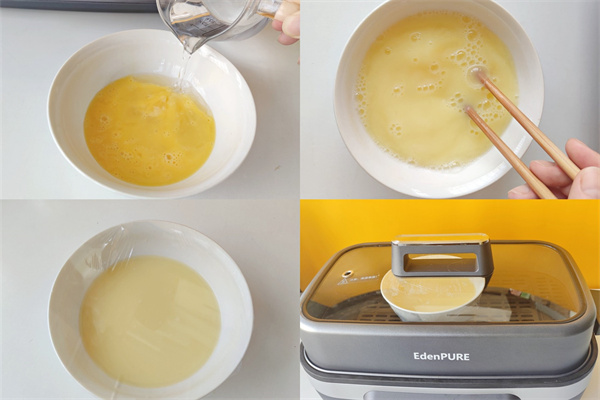 有很多朋友蒸不好鸡蛋羹,这里和大家分享我的方法,那就是使用保鲜膜,保鲜膜可以阻隔蒸汽滴下来的水,使其受热更均匀,最大程度地保留鸡蛋羹的水分,这样蛋液内水分含量高,口感才会更加顺滑软嫩。