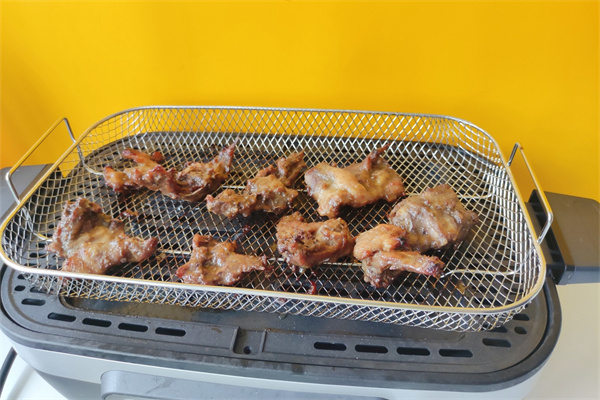解冻好的鸡架放入宜盾普多功能料理锅,选择空气炸功能,60高速循环均匀炸烤食物,这个空气炸做出来的口感,感觉比之前用烤箱好吃,更比油炸节省时间,而且油炸也不健康,还是宜盾普多功能料理锅省事。