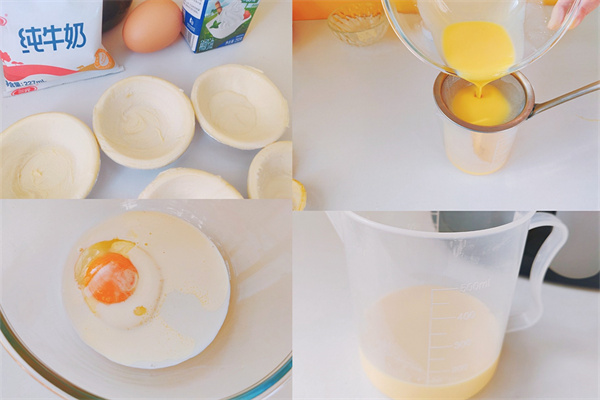 过滤一下是重点,我过滤两遍,这样可以更好的将蛋液中气泡过滤掉。然后在将量杯中的蛋液倒入蛋挞皮中,8分满就可以了。
