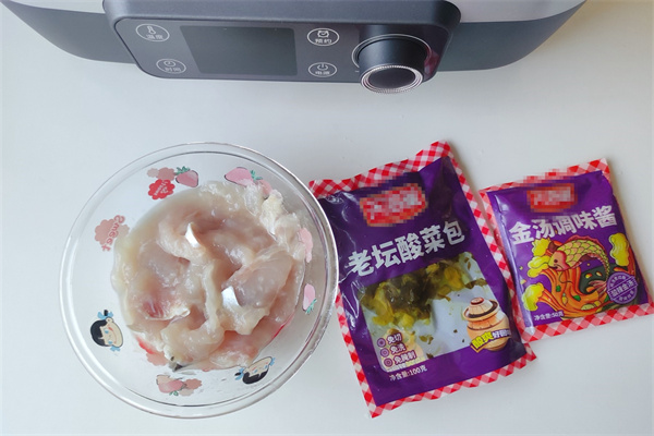 汤锅内烧水,水开后放入一份酸菜鱼调味料,就在超市有售。汤锅内的水再次烧开的时候,放入腌制好的巴沙鱼片,一片一片滑入,以免鱼片有粘连,待鱼片变白就可以了,汤锅超级实用。