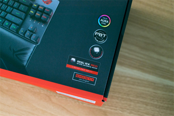 盒子的右侧 ,有各种标记,代表产品的特色,包括有ASUS AURA SYNC,支持ASUS全局彩光同步;PBT DOUBLESHOT,双色PBT注塑键帽等等。