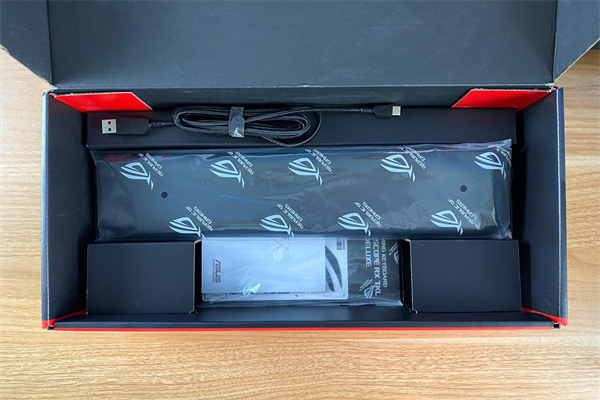 打开盒子,取出包裹在黑色袋子里的键盘,这款ROG游侠RX TKL三模机械键盘就展现在我们面前了。纯黑的按键,深灰色的机身,沉稳大方,右上角的ROG标记非常显眼。