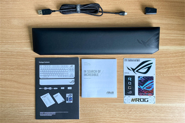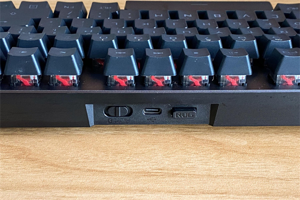 键盘的背面,有USB-C接口,是连接有线用的。一侧是三模模式开关,可以用来切换蓝牙2.4G无线有线的工作模式状态。另外一侧是USB无线接收器,上面有ROG的字样,这样有助于了解这款接收器是哪个品牌的。