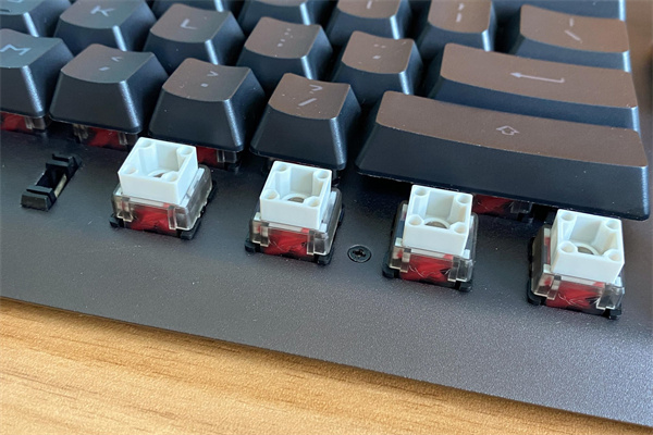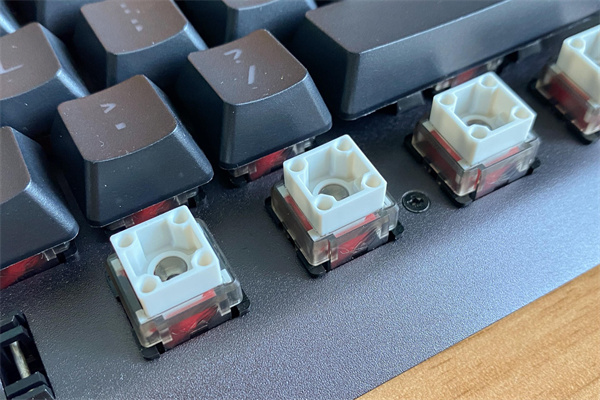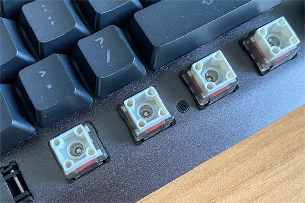 作为机械键盘,大家最为关心的内容之一就是轴了,而这款机械键盘,就是著名的RX轴体。取下键帽,我们看它是方形火山口结构,可以有更稳定的手感,无论按在键盘的哪个部分,都可以确保稳定按下触发。边上四角固定,可以让键帽更加稳定。中间是X结构的稳定器,有助于实现无抖动按键的目的。