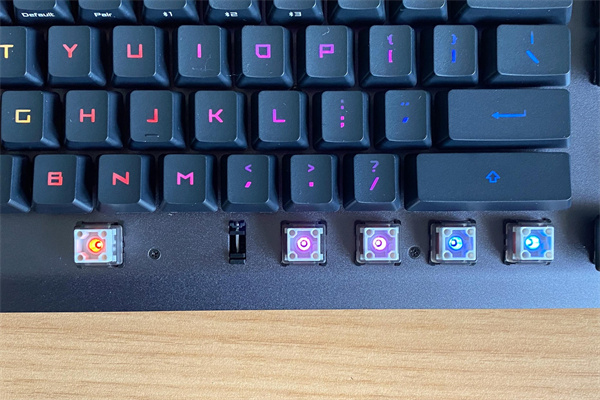 总的来说,这款ROG游侠RX TKL三模机械键盘给人的印象还是深刻的。首先是独特的轴体设计,光源触发,0延迟,打字舒畅,游戏反应灵敏。而且这个轴体的方形火山口结构,让按键特别的稳当。红轴的手感很不错,力度适中有感觉,又不吵。三模设计,应用很灵活。RGB光色柔和均匀,很漂亮。从功能上,最有特色的应该是一键隐藏键,且支持宏录制和按键功能自定义,对于游戏玩家来说是必不可少的。
