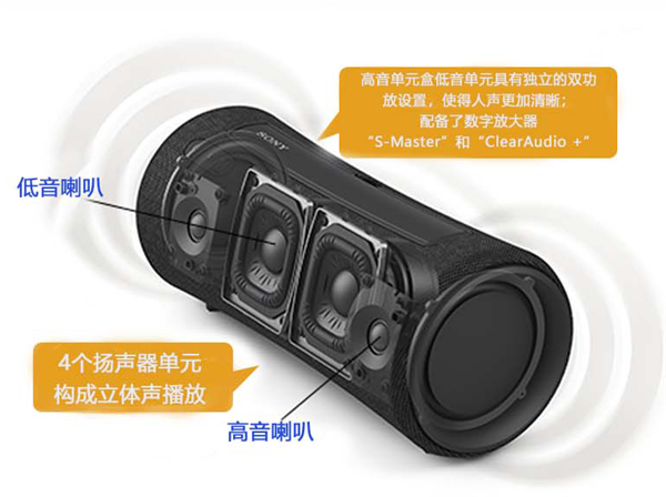 SRS-XG300。锥形圆柱形状和可伸缩手柄的组合使这款扬声器在更小的包装中更像是一个类似音箱的设计。为了给您提供多种声音选择,XG300 包含了增强低端响应的 Mega Bass 功能、用于“最平衡的声音”的 ClearAudio+ 和模拟在场地效果的现场声音模式。此外,Sony 的 Music Center 应用程序使您能够根据自己的喜好调整 EQ,并可以选择连接多个扬声器以实现Party Connect 或Stereo Pair模式 。